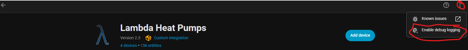 Schritt 1: Öffnen Sie Einstellungen → Geräte & Dienste → Integrationen, wählen Sie die Integration Lambda Heat Pumps und klicken Sie oben rechts auf die drei Punkte (⋮). Im Menü wählen Sie „Enable debug logging“.